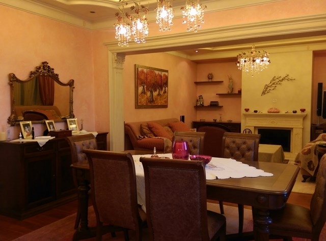 Oλο το σπίτι είναι καλυμμένο με δρύινα πατώματα, τα ταβάνια έχουν κρυφό φωτισμό με λεπτομέρειες από ζωγραφισμένα βιτρώ και οι χώροι υποδοχής είναι βαμμένοι με την τεχνοτροπία