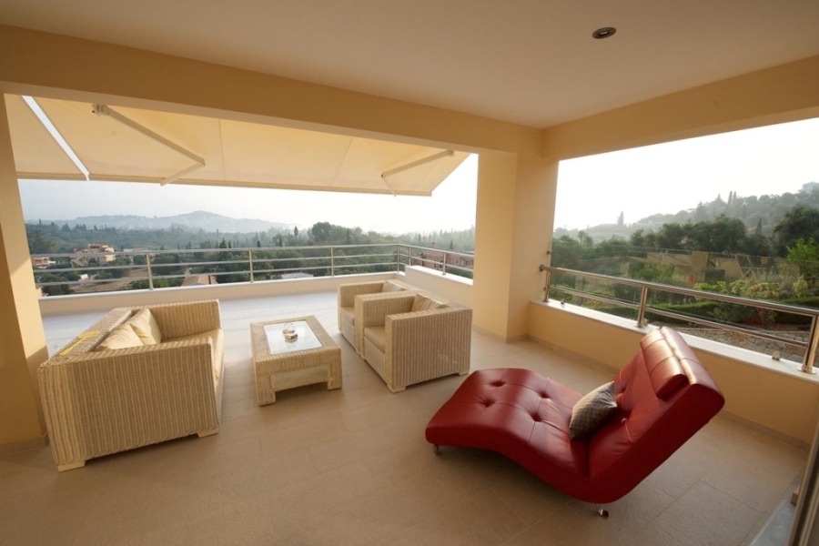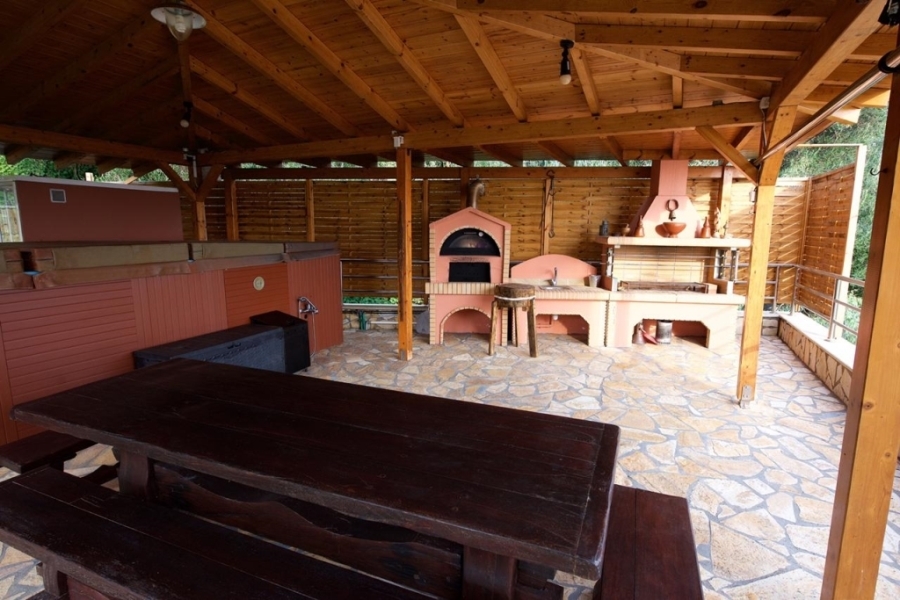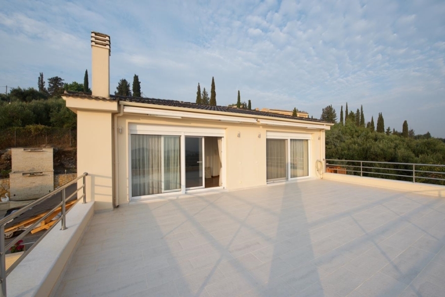All maisonettes have large verandas with unobstructed views of the sea and the green hills of Gouvia with the magnificent villas nestled among high cypresses and olive trees. Behind the last maisonette is a huge paved area with the barbeque and the built-in oven, the outdoor dining area, the SPA , the sauna and a water fall made of white stone as is also the wall that delimits the plot of the property.