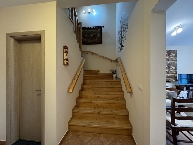 The comfortable wooden staircase leads on the upper level where are 2 bedrooms with balcony doors open to a covered balcony facing to the garden and a bathroom. In the hallway, at the end of the staircase, a kitchenette is available for the guests of the family.